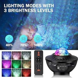 پروژکتور نور و لیزر سهبعدی با رقص نور ۱۰ حالته و قابلیت روشنسازی آسمان با کلید (S)، فضایی جادویی برای اتاق خواب، مهمانی یا سینمای خانگی میسازد.