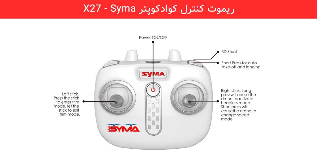 این کنترلر از کمپانی سایما، 4 کاناله و با فرکانس 2.4 گیگاهرتز است و امکان هدایت کوادکوپتر X27 را تا ارتفاع 50 متر فراهم میکند.