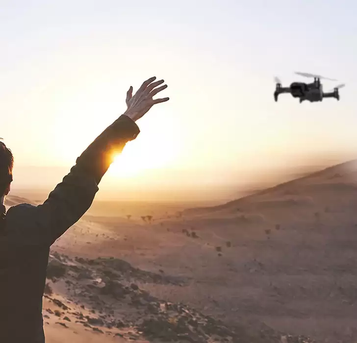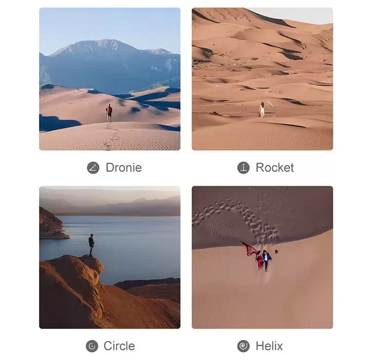 - Dronie: کوادکوپتر به سمت عقب و بالا پرواز میکند و کاربر را در مرکز تصویر نگه میدارد.