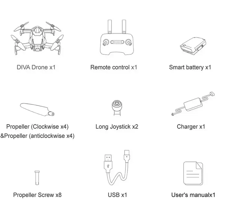 پک کوادکوپتر Diva 01 شامل کوادکوپتر، باتری، ریموت کنترل، ملخهای یدکی، شارژر، کابل USB، پیچ و دفترچه راهنما است. تمام اقلام مورد نیاز برای شروع فیلمبرداری با کوادکوپتر Diva 01 در داخل این بسته قرار دارد.