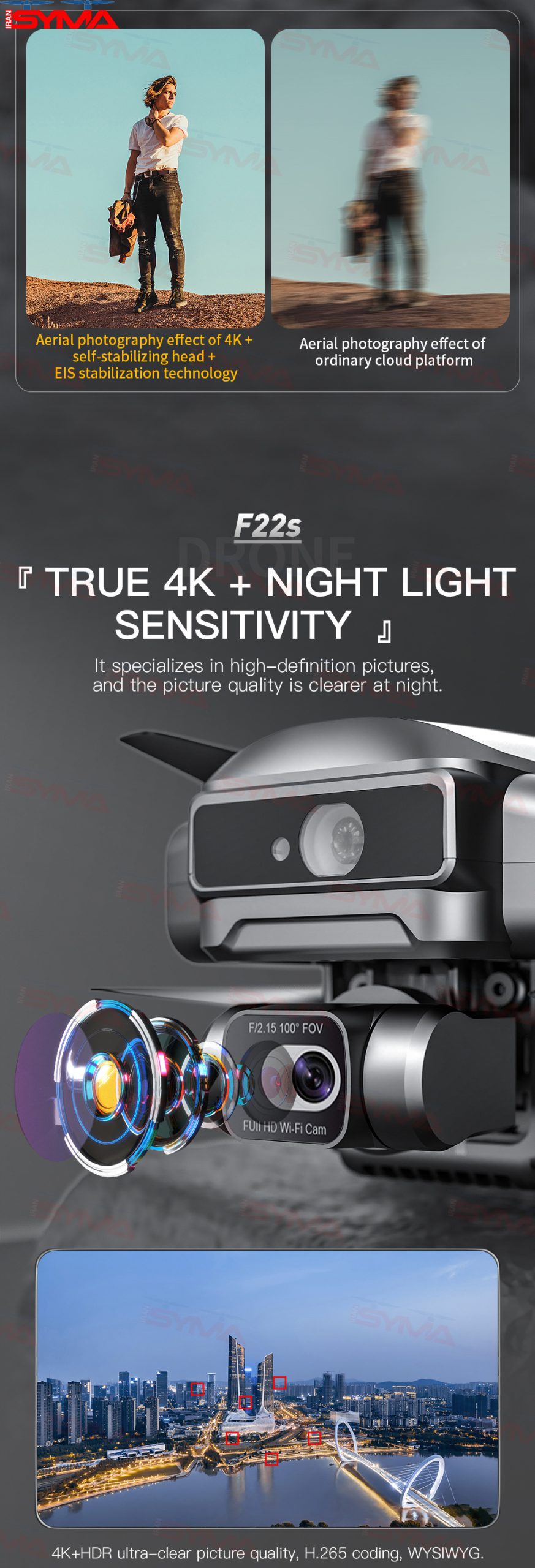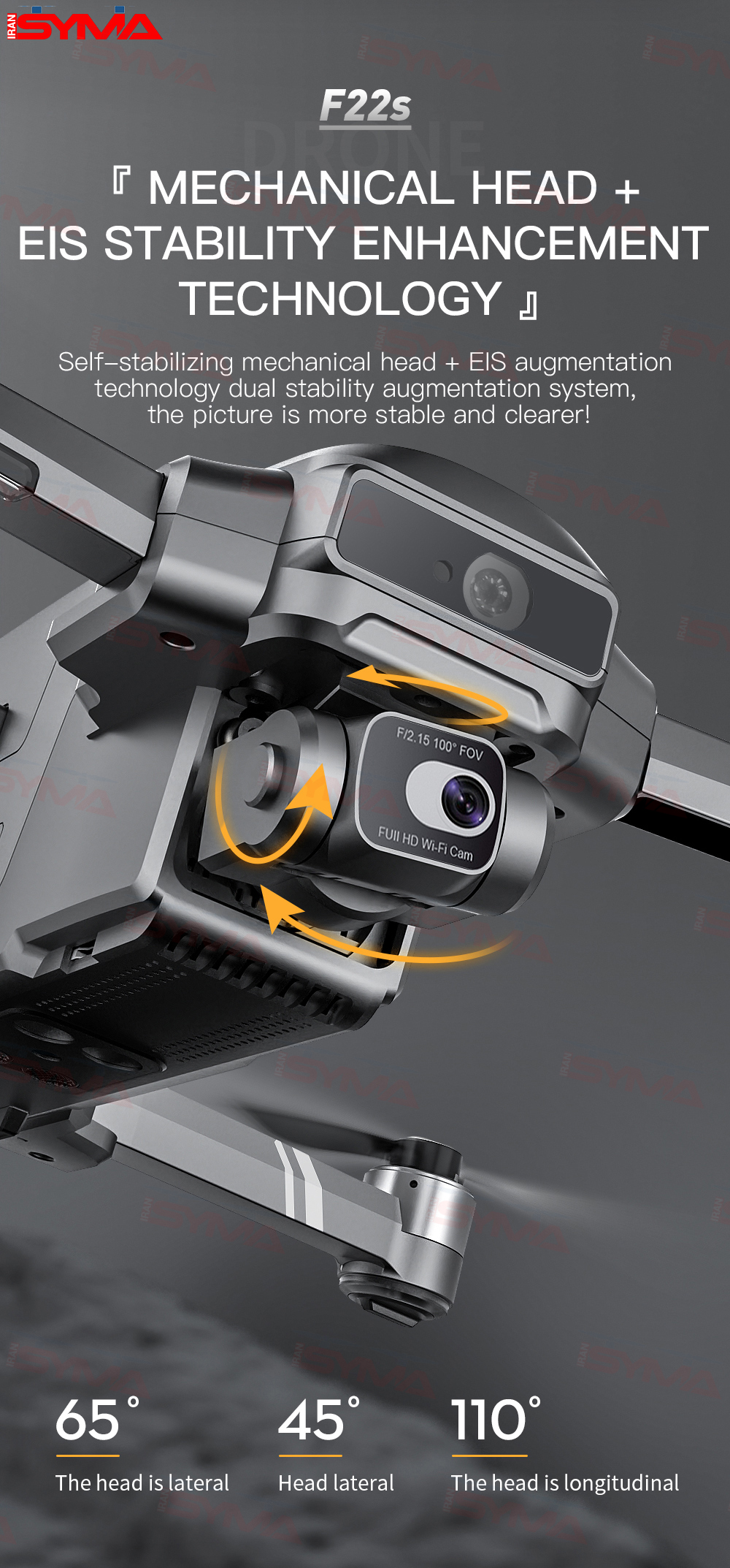 گیمبال دو محوره معمولا، دوربینهای کوادکوپترها از گیمبالهای سه محوره برای لرزشگیری استفاده میکنند. اما SJRC F22s PRO از گیمبال دو محوره مکانیکی برخوردار است که به دوربین امکان حرکتهای آرام و تند در دو جهت عمودی و افقی را میدهد. این ویژگی به تصویربرداری استادیومی و حرکات سینماتیک کمک میکند.