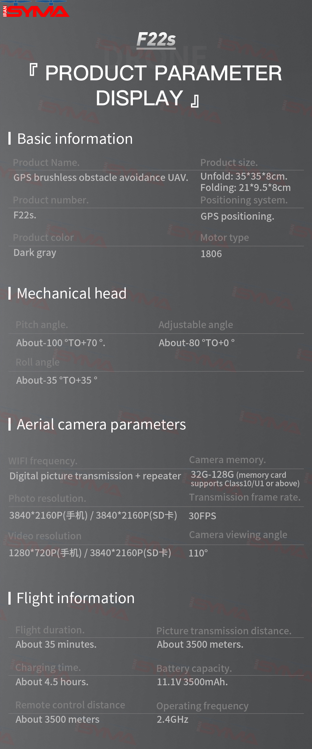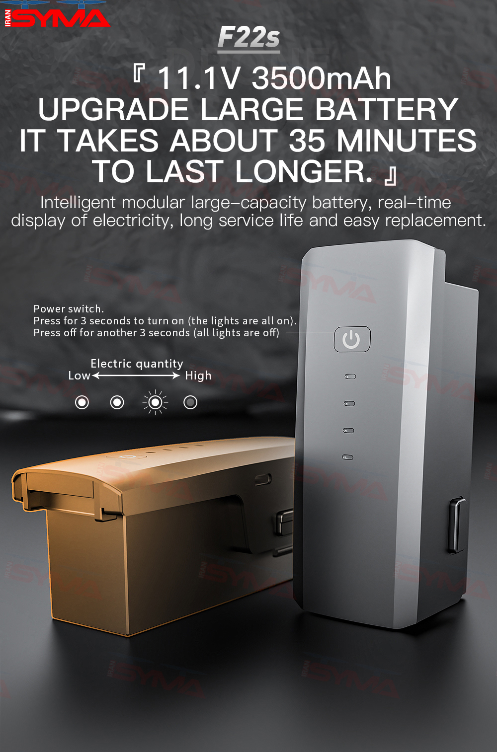 کوادکوپتر f22s pro با باتری قوی 3500mAh مجهز شده است که به کاربر امکان پرواز بلندتر و دورتر را با مدت زمان تا ۳۵ دقیقه میدهد. این ویژگی به ویژه برای علاقمندان به عکاسی و فیلمبرداری هوایی اهمیت دارد، زیرا فرصت بیشتری برای ضبط تصاویر با کیفیت و دلپذیر فراهم میکند.