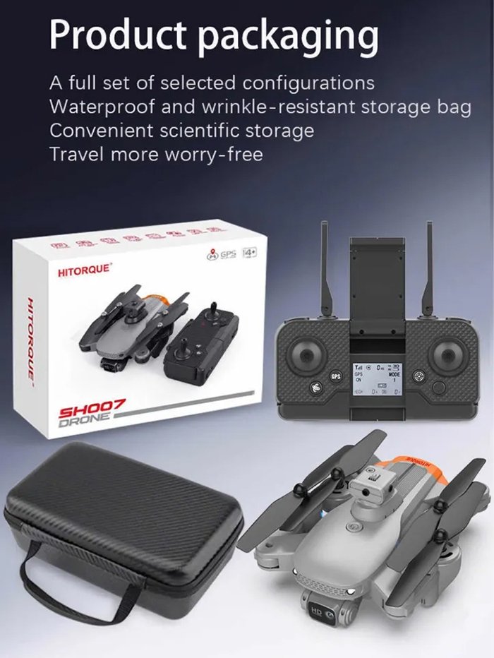 کوادکوپتر هایتورک HITORQUE SH007-S دارای رادیو کنترل کاملا حرفه ای است. این رادیو با فرکانس ۲.۴ گیگا هرتز اتصال خوبی را با کوادکوپتر برقرار می کند و دکمه ها و جواستیک ها طوری قرار گرفته اند تا در محوطه دست به خوبی جا شوند و بتوان به همه دکمه ها دسترسی کامل داشت. این رادیو دو زبانه برای قرارگیری گوشی موبایل دارد تا بتوانید در لحظه تصویر خروجی از کوادکوپتر را مشاهده کنید. همچنین این کنترل دارای صفحه نمایش LED است و تمامی اطلاعات پروازی از قبیل GPS و ارتفاع پرواز و غیره را می توانید در آن مشاهده کنید.