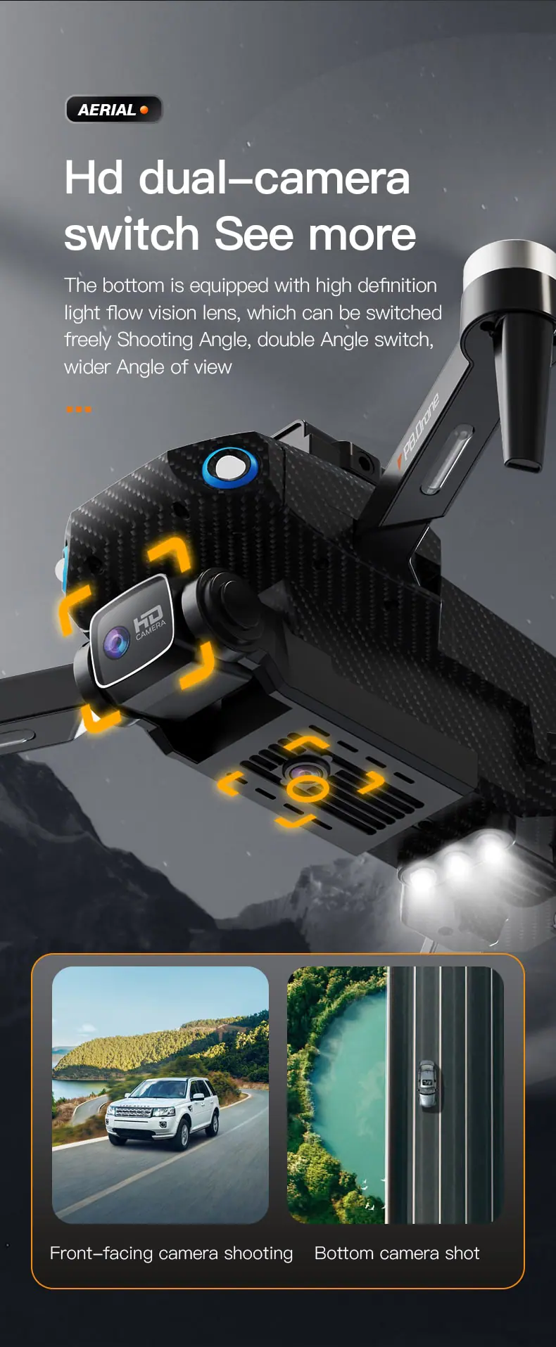 همچنین دوربین جلوی کوادکوپتر P8 PRO دارای زاویه دید وسیع 120 درجه است، که به شما این امکان را میدهد تا تصاویر گستردهتری از منظره را در حین پرواز روی گوشی موبایل خود مشاهده کنید. دوربین دوم نیز در زیر کوادکوپتر قرار دارد، که این ویژگی به شما امکان ضبط تصاویر از زاویههای مختلف را میدهد.
