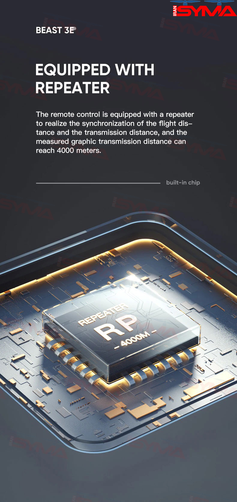 رپیتر برای تقویت برد رادیویی برای بهبود برد ارتباطی، روی بورد اصلی کوادکوپتر، یک رپیتر (تقویتکننده سیگنال) نصب شده است که برد رادیویی را به حداکثر ممکن افزایش میدهد. این ویژگی به کوادکوپتر امکان انتقال اطلاعات در شرایط نویز کمتر را میدهد و باعث بهبود کیفیت ارتباط میشود.