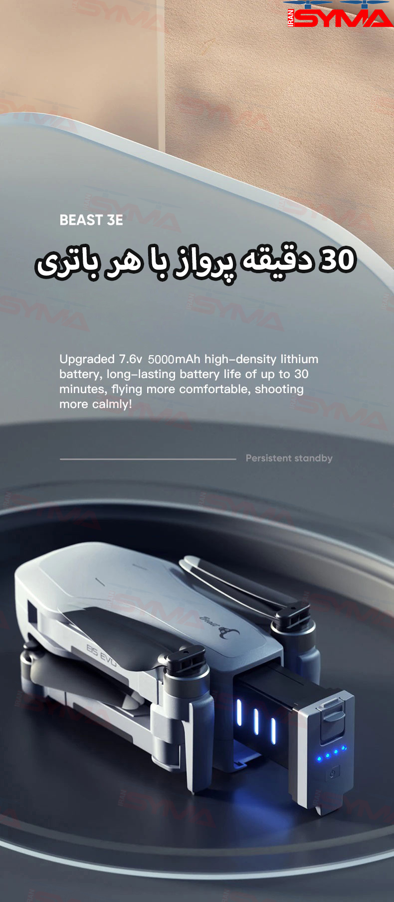 کارایی باتری با ظرفیت 5000 میلیآمپر ساعت باتری لیتیومی کوادکوپتر SG906 MAX 2 با ظرفیت 5000 میلیآمپر ساعت و ولتاژ 7.6 ولت از قدرت و کارایی بالایی برخوردار است. این باتری به کاربر اجازه میدهد تا به مدت حدود 30 دقیقه در آسمان پرواز کند و تصاویر هوایی با کیفیت برداری کند.