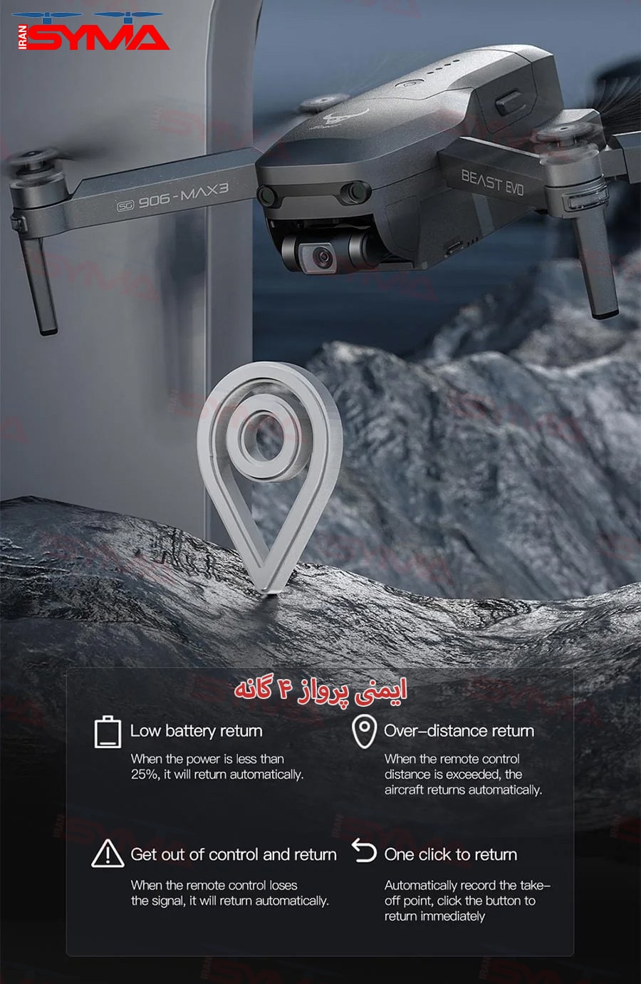 یکی دیگر از ویژگیهای مهم در کوادکوپتر ZLL SG906 MAX 3 ، سیستم بازگشت خودکار و هوشمندانه آن است. این کوادکوپتر با توجه به شرایط مختلف، به صورت خودکار به محل ایمن باز میگردد. این قابلیت در سه حالت زیر فعال میشود: