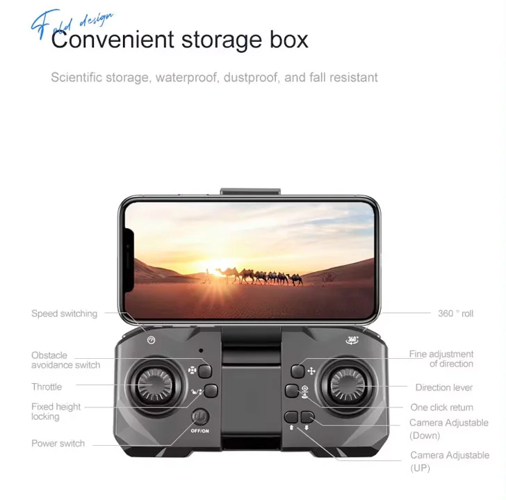ریموت کنترل کوادکوپتر S115 با فرکانس 2.4 گیگاهرتز، کنترل دقیق و بدون تداخل را تضمین میکند. با برد 300 متری، کاربران میتوانند پهپاد را از فواصل دور هدایت کنند. این ریموت دارای هولدر موبایل برای مشاهده زنده تصاویر و دسترسی به تنظیمات پرواز است، و طراحی ارگونومیک آن تجربهای راحت و کارآمد از پرواز را فراهم میکند.