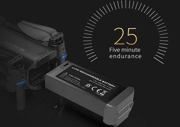 کوادکوپتر kai one از یک باتری لیتیومی با ولتاژ ۷.۴ ولت و ۲۲۰۰ میلی آمپر ظرفیت تغذیه می شود. این باتری برای شارژ کامل ۹۰ دقیقه زمان احتیاج دارد و با هر بار شارژ کامل حدود ۱۵ تا ۲۰ دقیقه تایم پرواز به کاربر می دهد. با خرید این کوادکوپتر از مجموعه ایران سایما یک عدد باتری اضافه هم به عنوان هدیه به خریداران این محصول ارایه می شود که به کمک آن می توان به حدود ۳۵ تا ۴۰ دقیقه تایم پروازی رسید که عددی بسیار فوق العاده می باشد.