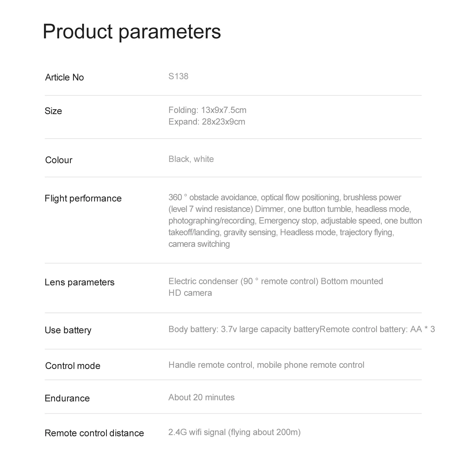 از دیگر ویژگیهای کوادکوپتر S138 میتوان به وضوح بالای دوربین در شرایط نوری کم، پرواز بسیار پایدار و صاف، قابلیت کنترل از راه دور با فرکانس 2.4 گیگاهرتز و 6 محور ژیروسکوپ اشاره کرد. همچنین، با باتری قوی و با ظرفیت بالا، این کوادکوپتر میتواند به طور مداوم تا 14 دقیقه پرواز کند. به علاوه، با قابلیت جمع شدن و حمل آسان، این کوادکوپتر را میتوان به راحتی در کیف خود قرار داد و همیشه با خود داشت.