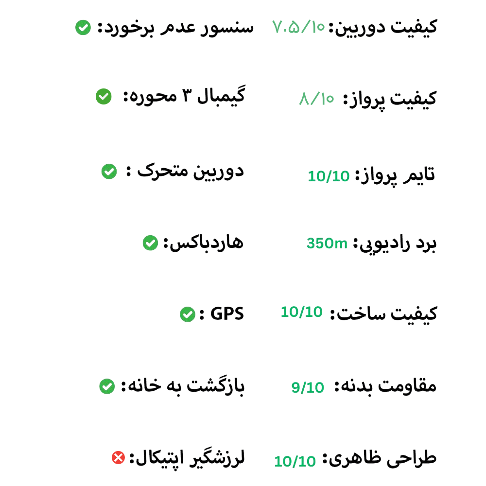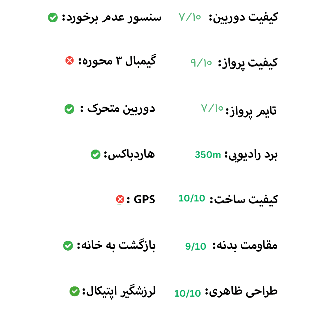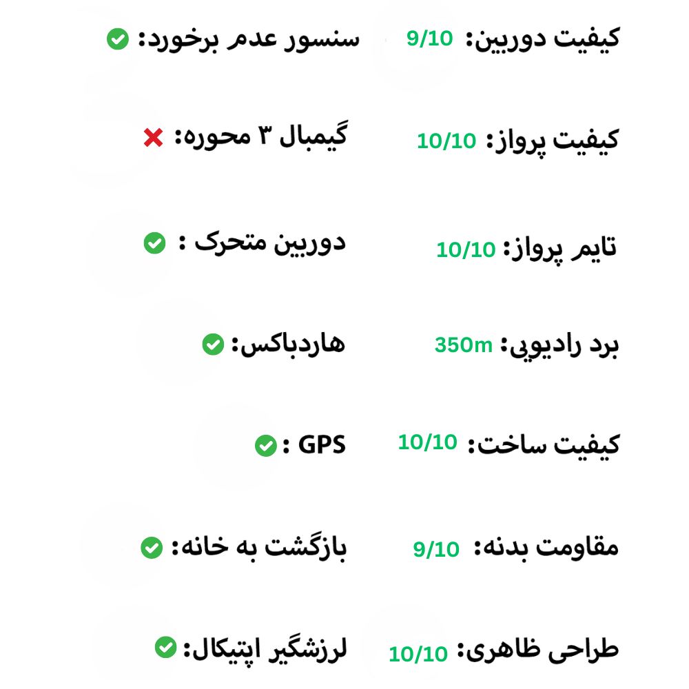 بررسی کوادکوپترها و هلیشاتهای پرفروش و معتبر در رنجهای قیمتی مختلف و مقایسه عملکرد و ارزش خرید آنها، یکی از خدماتی است که مجموعه ایران سایما میتواند به علاقمندان به خرید هلیشات و کوادکوپتر ارائه دهد. این اقدام به علاقمندان به این حوزه کمک میکند که با در نظر گرفتن پیچیدگیهای موجود، خریدی منطقی و با کیفیت داشته باشند و از تجربه خریدی مطلوب و رضایتبخش برخوردار شوند.